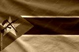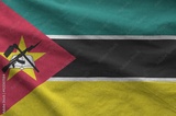 Mozambique flag depicted on folded wavy fabric of old cloth close up