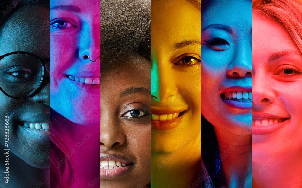 Powerful collage of women's faces, each illuminated in vibrant colors, celebrating gender equality and strength of women. Concept of youth, diversity, human emotions, human rights, social equality. Ad