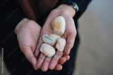 A girl in holds snail shells in her hands.