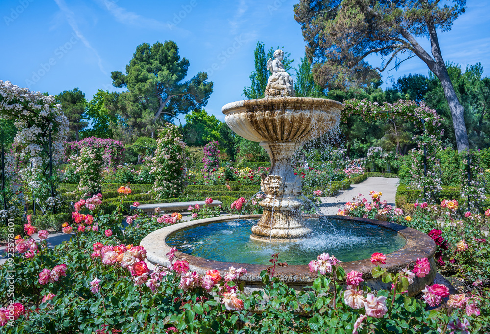 View of the fountain in the Rose Garden at El Retiro park. Madrid.