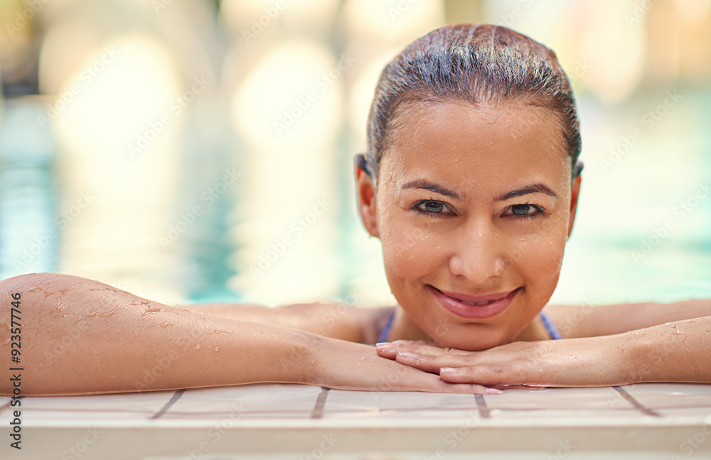 Woman, portrait and relax in water by pool side for summer vacation, getaway and weekend trip. Happy, female person and face with smile at hotel for swimming, holiday and tourist resort in Greece