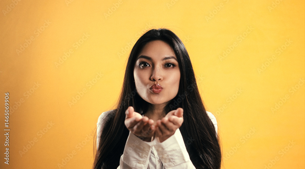 Lovely Chinese Child Girl Opening Birthday Box Gift Standing on Yellow Backdrop