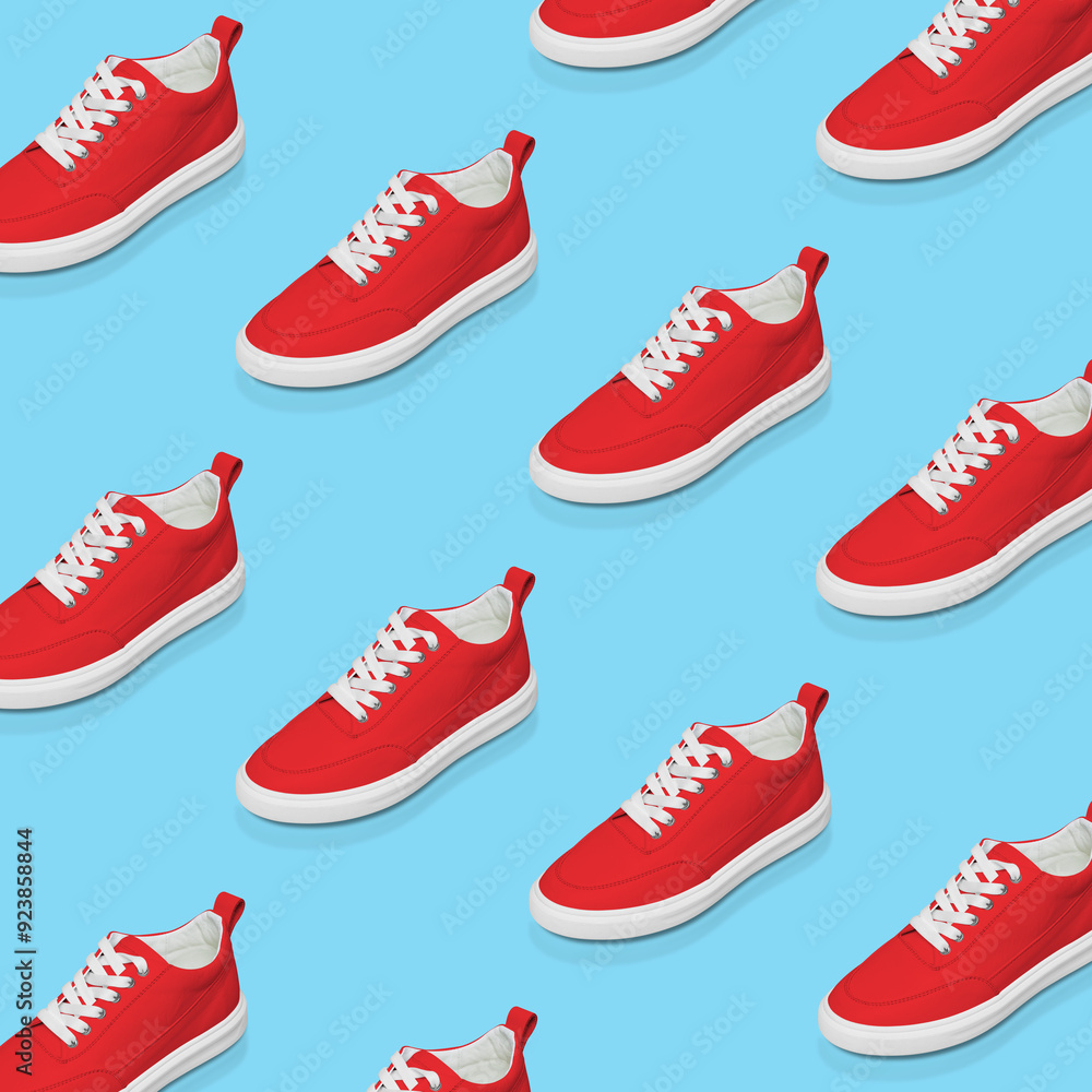 Red sneaker on a blue background. Pop art design. Flat minimal lay style.