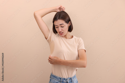 Emotional woman in t-shirt before using deodorant on beige background