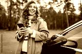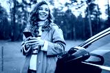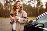 Young woman standing by the car and using phone. Car sharing, rental service or taxi app. Lifestyle, travel, tourism, active life.