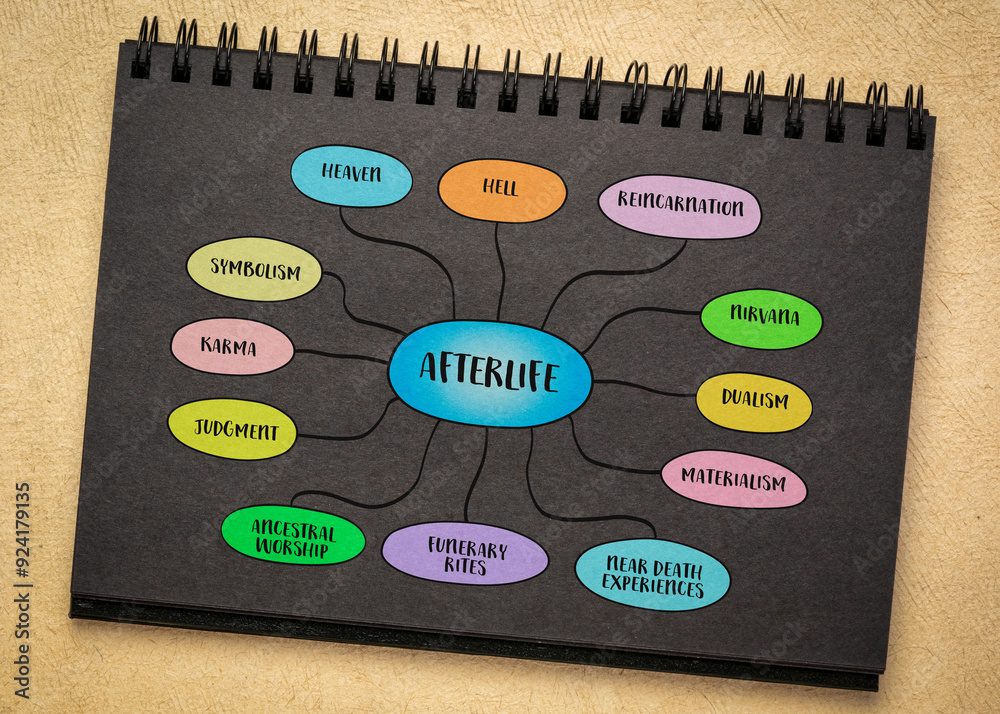 Afterlife concept, beliefs, traditions, and ideas about what happens to an individual's soul or consciousness after death. Infographics mind map sketch.