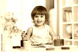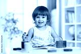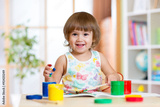 Happy child girl with hands painted color paints