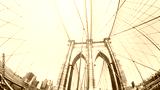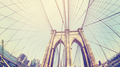 Retro stylized photo of Brooklyn Bridge, fisheye lens, NYC, USA.