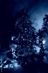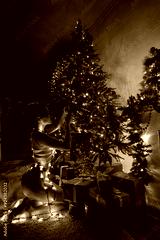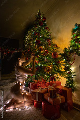 Beautiful sexy brunette in lingerie lies and holds a gift against the background of a Christmas tree