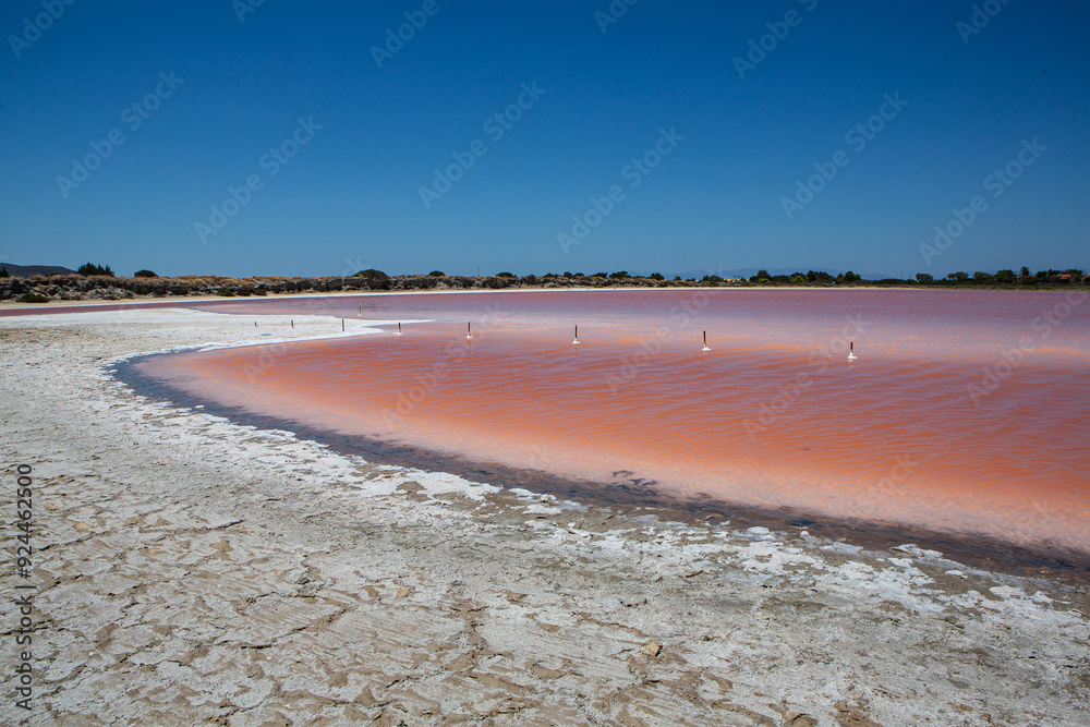 Pink salt lake evaporation pond reflecting blue sky on sunny day