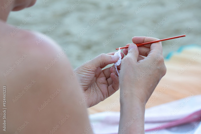 Woman crocheting a white doily on the beach