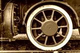 Rusty steam train wheel showing intricate details from an old locomotive in a picturesque setting