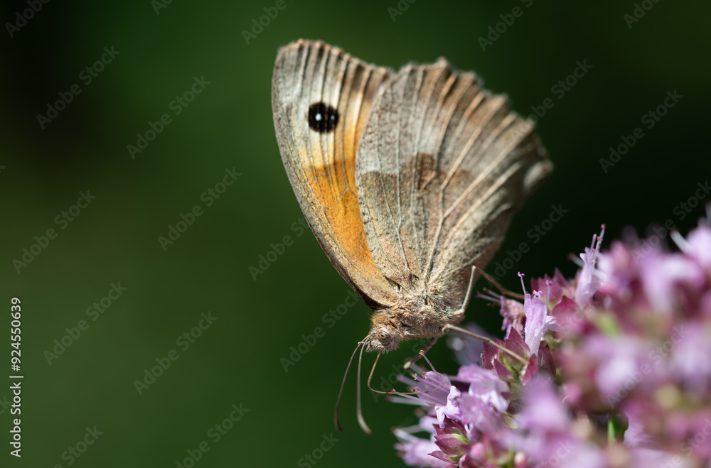A small butterfly, a large ox-eye (Maniola jurtina), sits on the flowers of wild marjoram. In the background, nature is green with space for text