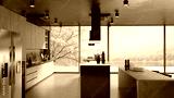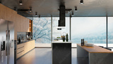 3D illustration of a contemporary kitchen with natural wood and marble materials.