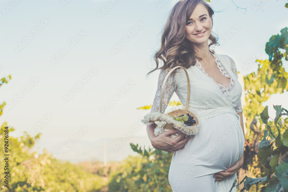 Pregnant girl with basket of grapes in vineyard