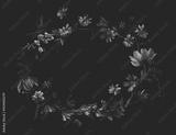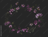 oval floral frame or wreath made of delicate pink garden flowers and willdflowers against a dark background, perfect for cards, wedding stationery or monograms, flowers isolated on black