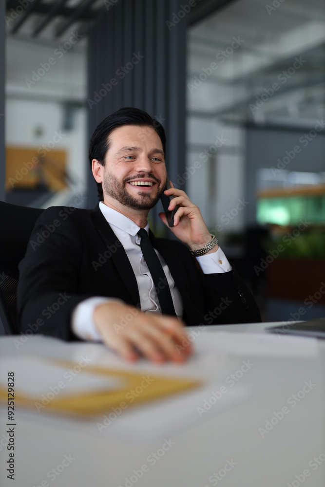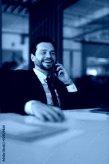 A man in a suit is talking on his cell phone. He is smiling and he is enjoying the conversation
