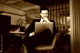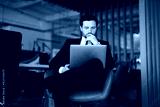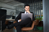 A man in a suit is sitting in a chair with a laptop in front of him. He is focused on his work, possibly typing or browsing the internet. Concept of professionalism and productivity