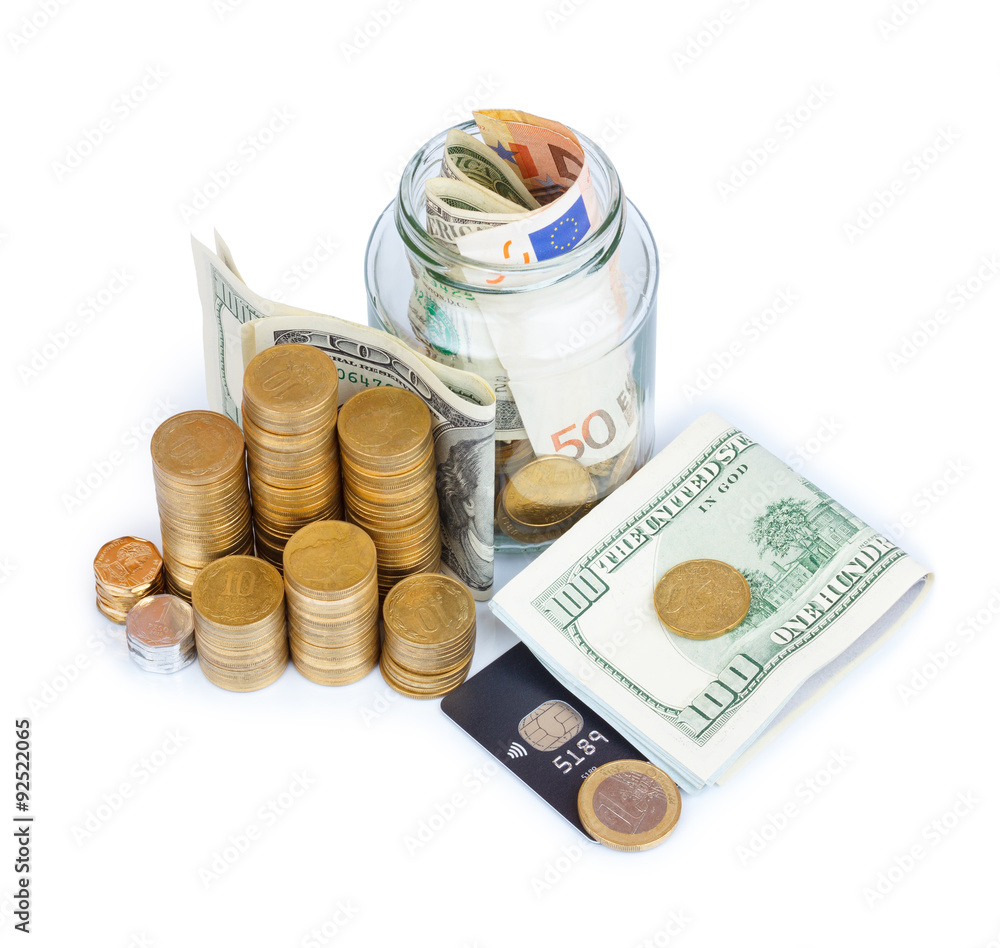 Coins stacks with paper currency and jar full or bills and coins with credit card isolated on white