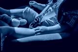 a baby or young child seated in a car seat. The child is wearing a striped shirt and is secured with a safety belt. The car seat is cushioned and appears to be in a vehicle, with sunlight casting