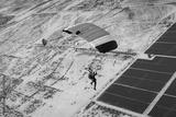 Woman flying orange parachute over the desert