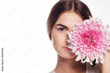 Young girl with chrysanthemum flower on half face