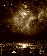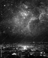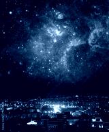 City landscape at nigh with sky filled with stars. Elements of this image furnished by NASA.