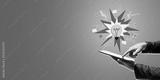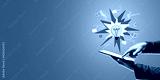 Businessman using tablet with pop art lightbulb and icons on blue background, concept of technology and creativity.