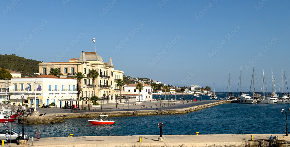 Spetses island, Greece. Seafront buildings and motor boats taxis at small port of Dapia
