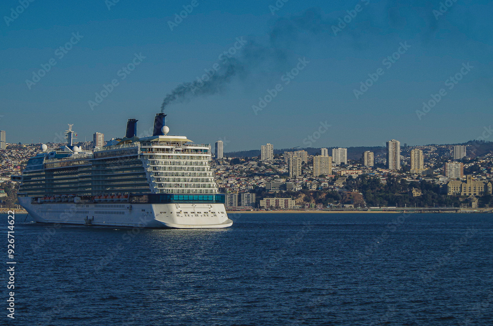 Luxury Celebrity cruiseship cruise ship liner anchoring ashore in front of Valparaiso, Chile during summer South America cruising