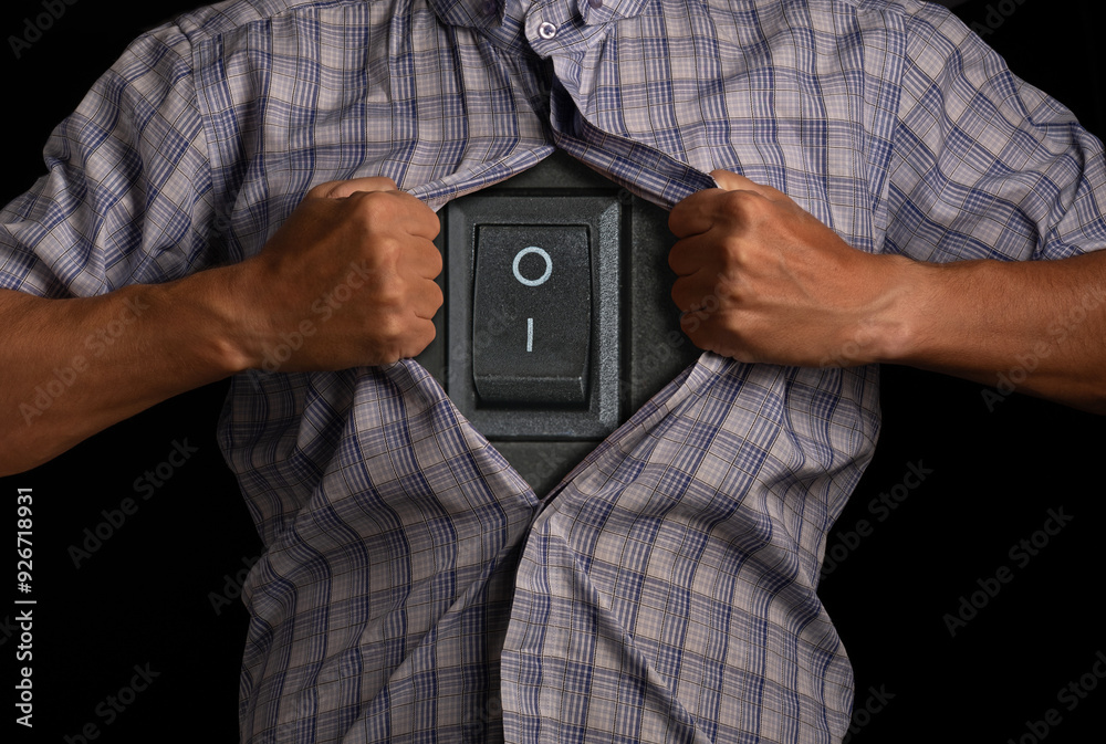 Man tears open his shirt, exposing switch instead heart, symbolizing control over inner state.