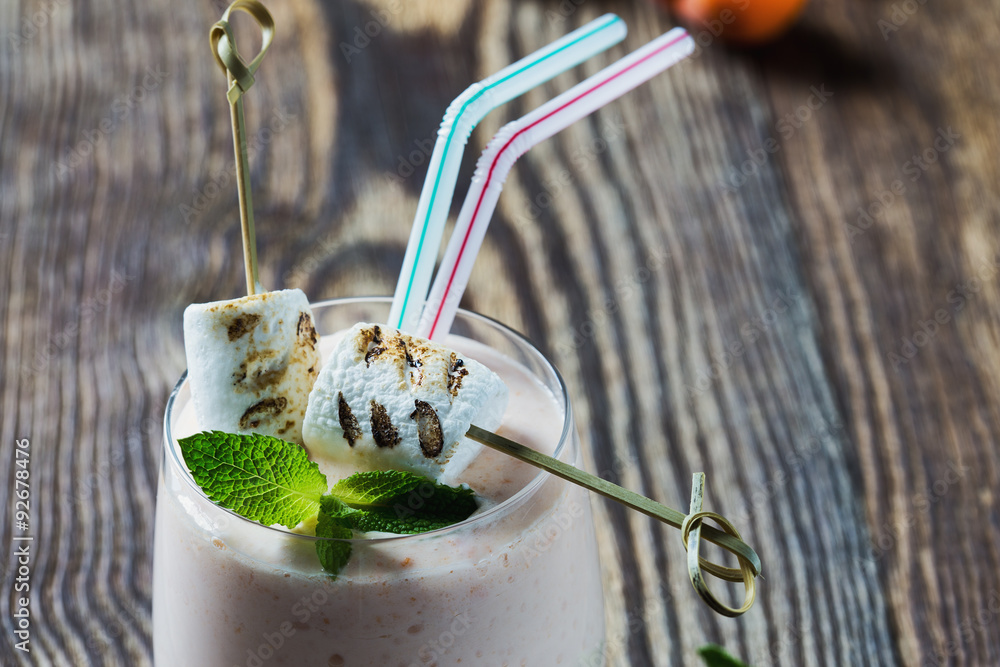Homemade fresh summer fruits milkshake with toasted marshmallow