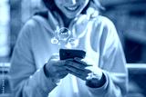 Digital AI chatbot, Happy young Asian woman using mobile smartphone with AI chatbot for online information in city town, conversation assistant.