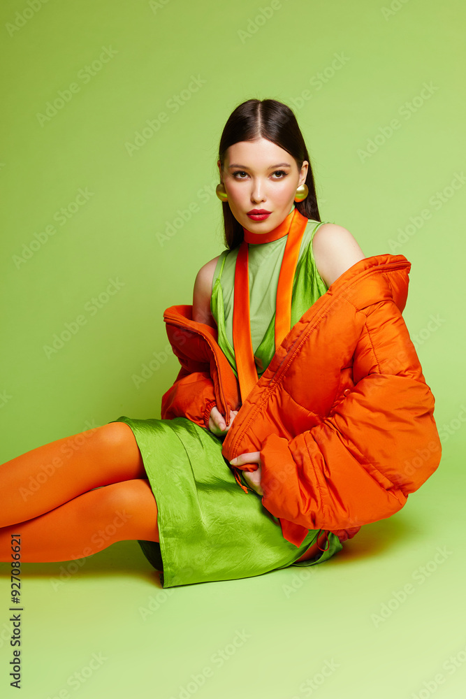 High fashion portrait of young asian woman on light green background. Orange down jacket, orange tights, light green dress, orange tie