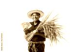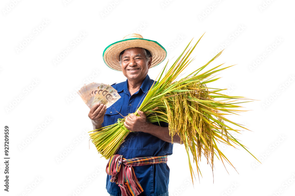 Portrait smiling of elderly Asian farmer man wear a hat, blue shirt holding rice plant and Thai banknotes money isolated on white background.