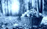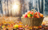 A Beautiful Autumn Basket Filled with Fresh, Juicy Apples Surrounded by a Scenic Forest View