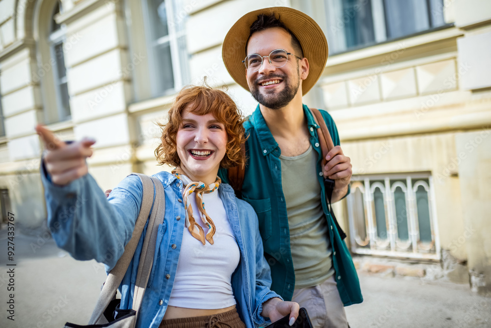 Young couple exploring the new city. Hugging and walking through the center. Wearing hats and backpacks.
