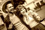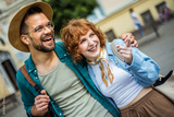 Young couple in love exploring the new city as they are walking and hugging in the city center. Travelling concept.