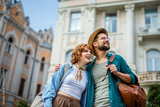 Young couple in love exploring the new city as they are walking and hugging in the city center. Travelling concept.