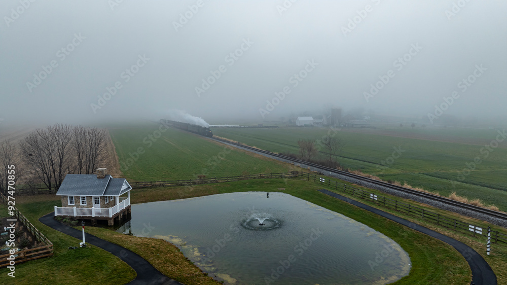 A train travels through a foggy countryside, passing a little house and a pond with a fountain, surrounded by fields.