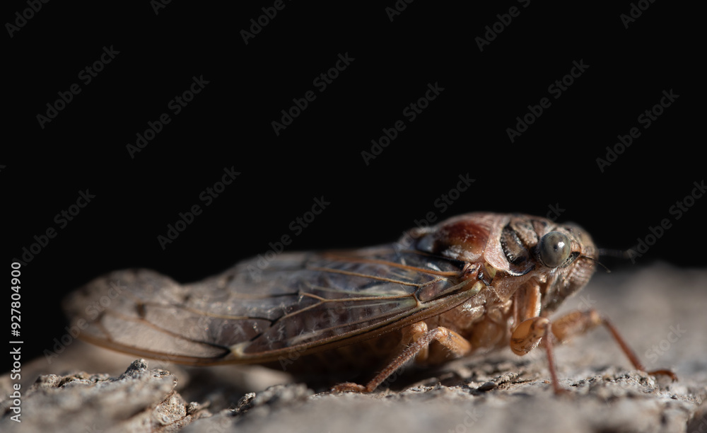 Close-up of a cicada sitting on a piece of tree bark. The background is dark. There is space for text.