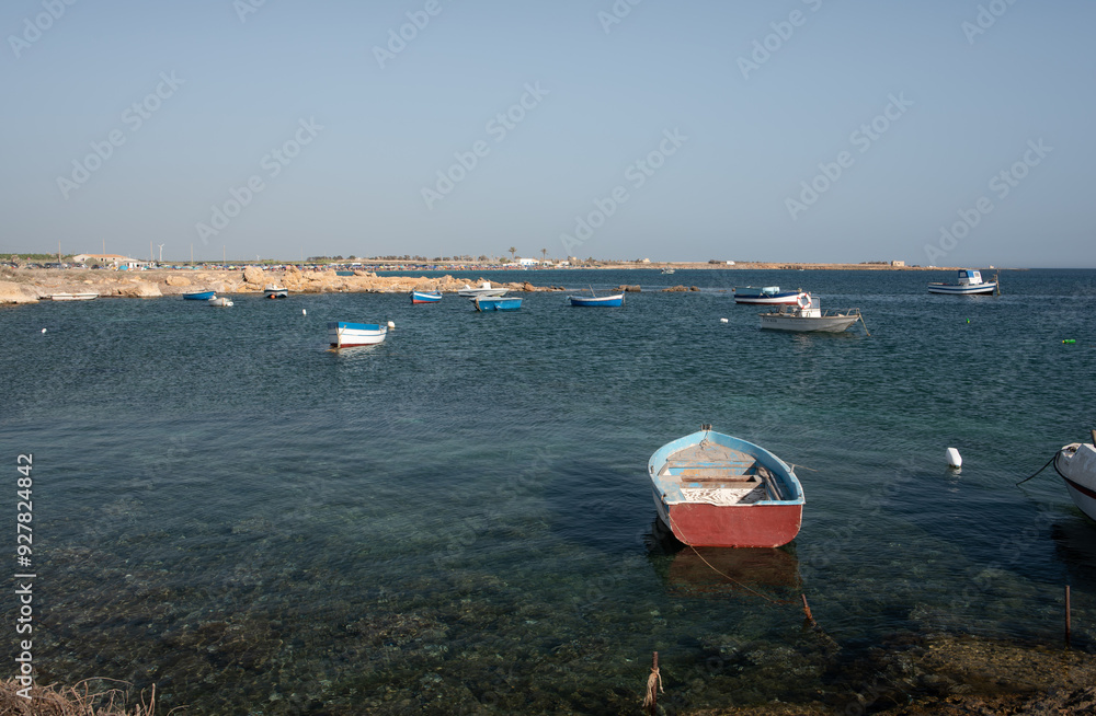 On the shores of the Mediterranean, small boats float in the water and are moored to the shore. In the background, the horizon and the blue sky.