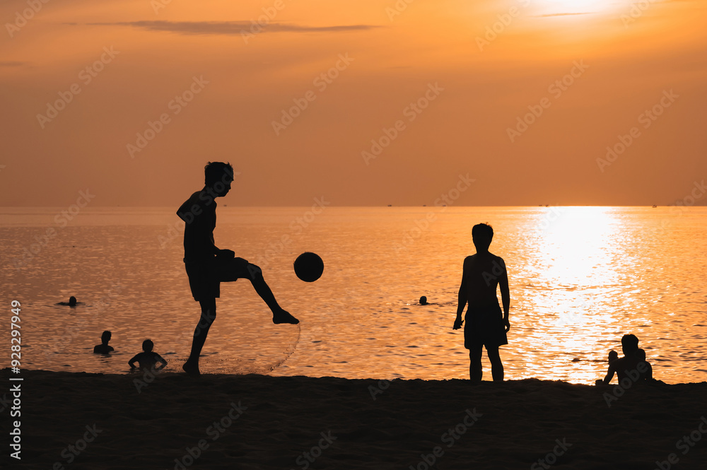 Silhouette of a man kicking a ball playing traditional Asian beach football on the beach by the sea at sunset