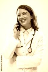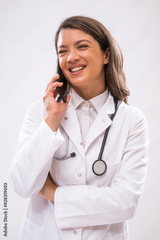 Portrait of happy doctor who is talking on phone with patient.