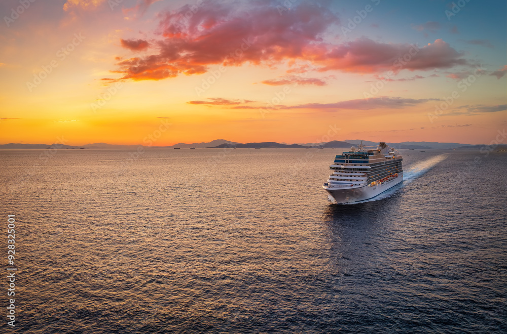 Aerial view of a generic cruise ship traveling over the ocean during golden summer sunset time with copy space