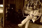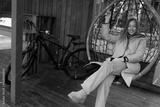 Woman Sitting in Hanging Chair on Porch