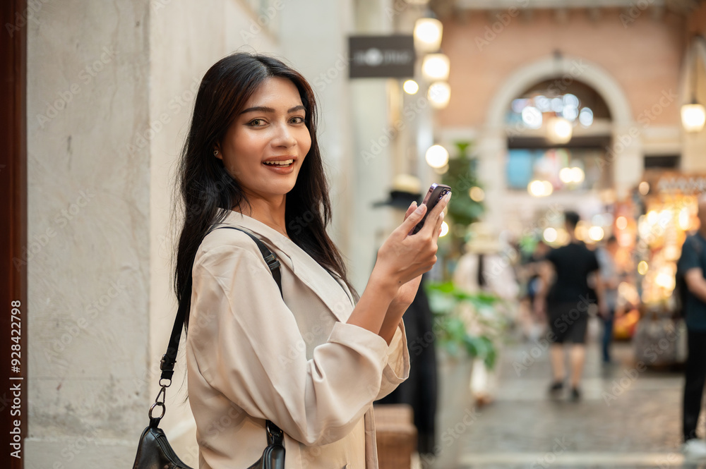An attractive, happy Asian woman in fashionable clothes stands in a shopping street in the city.