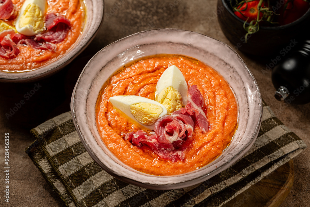 Spanish traditional creamy tomato soup salmorejo, made of tomato, bread, extra virgin olive oil and garlic and served cold with iberico ham and hard-boiled egg.