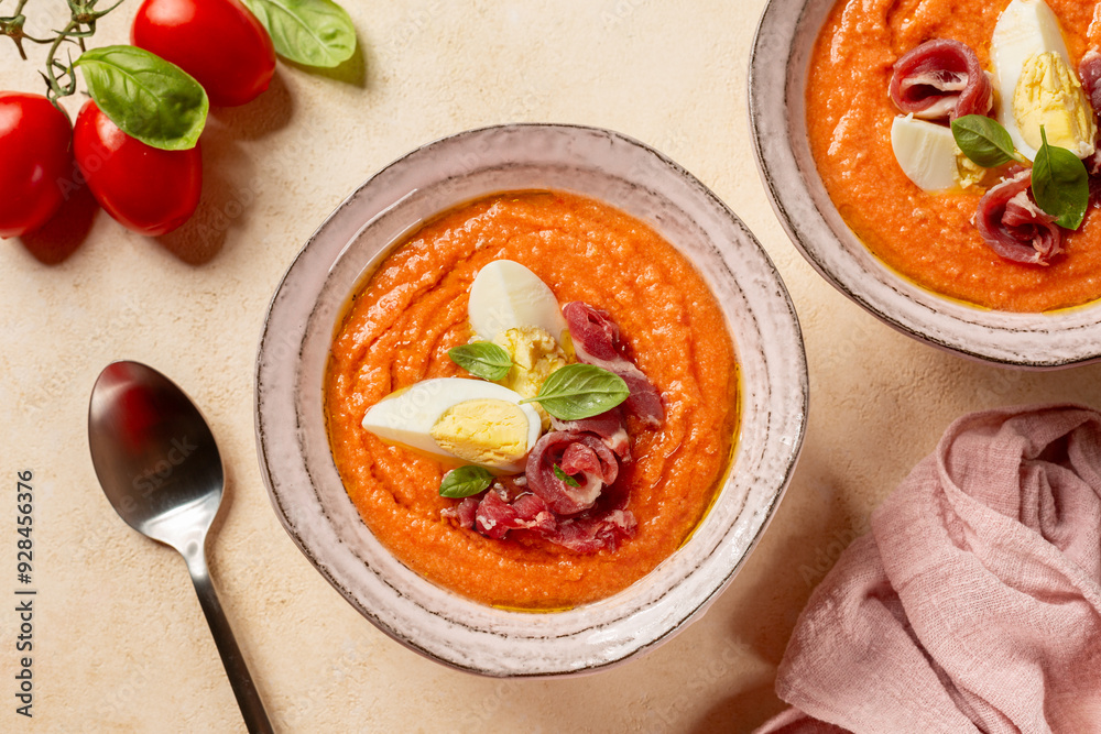 Summer Salmorejo soup, Spanish traditional creamy tomato soup made of tomato, bread, extra virgin olive oil and garlic, served cold with ham and hard-boiled egg, basil leaves.
