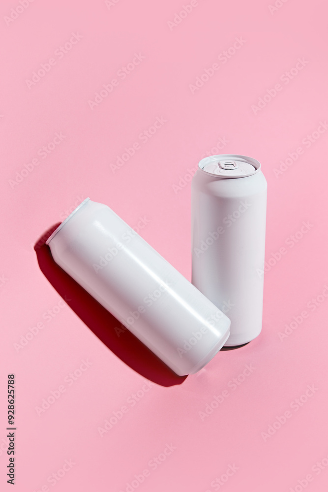 Mockup of two tall, white aluminum cans against soft pink background. Simple design for different drinks, soda water, beer, lemonade, coffee drinks, energy drinks. Template for brand promoting ads